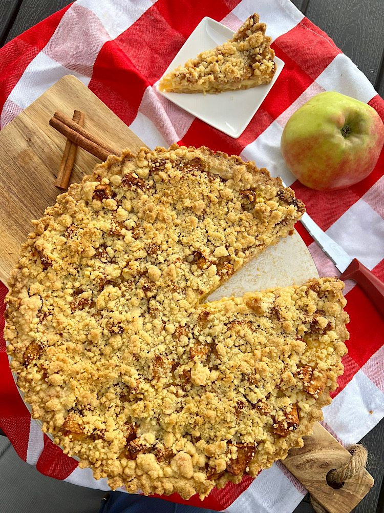 Deze appelkruimel koek wilde ik ook al zo lang maken. Mijn jongens zijn al dol op de appelkruimelkoek zonder gele room, met gele room zou dus ook wel zeker in de smaak moeten vallen. De koek kun je in elke gewenst vorm wel maken, rechthoek, rond, vlaaivorm etc. Hou ongeveer een doorsnede aan van ca 22 cm, dan moet het goed komen. Voor dit recept gebruikte ik mijn recept van de appelkruimelkoek van het bakbliken voegde een laagje van mijn banketbakkersroom ertussen. Je kunt ook een laagje jam proberen, lijkt me ook heel lekker trouwens.