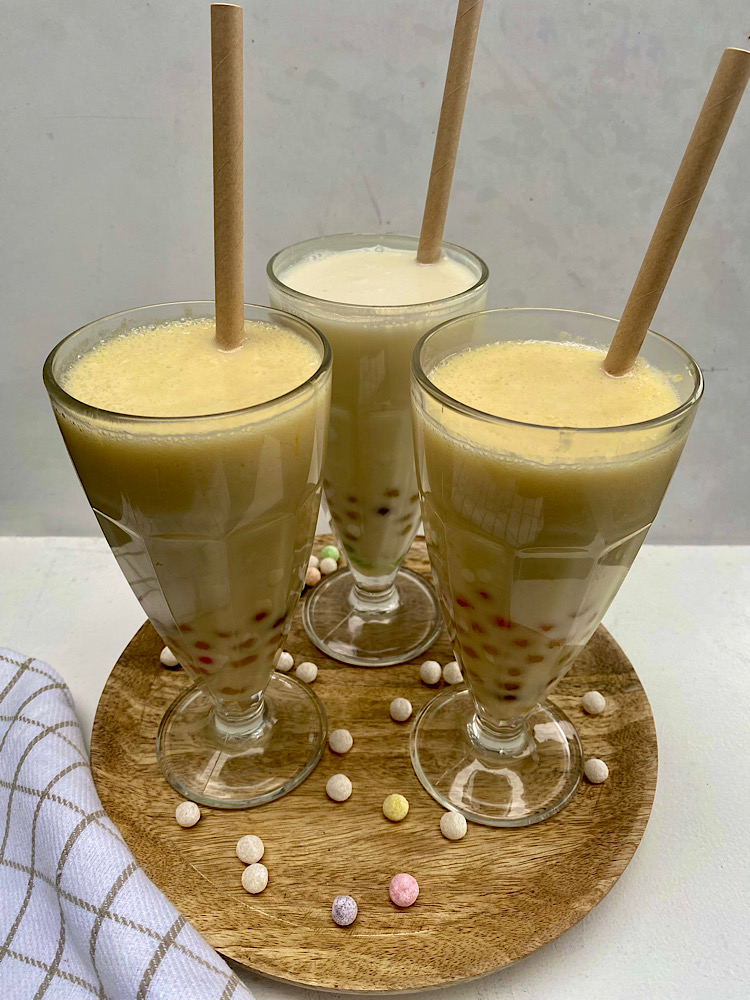 Bubble ice tea of ook wel Boba genoemd heeft Nederland veroverd. Inmiddels heb ik heel wat variaties uitgeprobeerd omdat onze jongens hier echt gek op zijn. Ik probeerde nu een variant met mango, maar je kunt wel iedere fruitpuree hiervoor gebruiken. Heerlijk!
