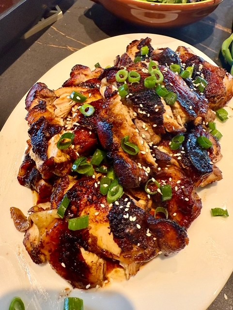 De char siu marinade karameliseert in de oven en vorm een heerlijke laag om de kip. Heerlijk met witte rijst en gewokte paksoi of snijboontjes.