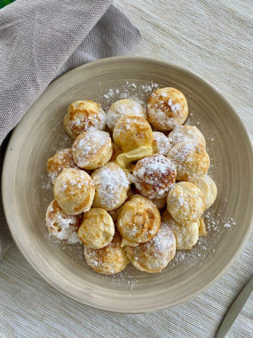 Haal de poffertjes uit de pan en vet de pan opnieuw in en herhaal de stappen totdat het beslag op is.