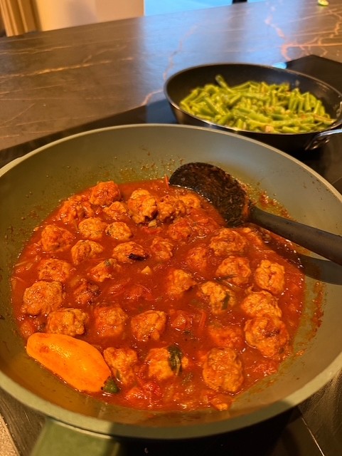 Wij aten de gehaktballetjes met witte rijst en broccoli uit de wok. Erg lekker!