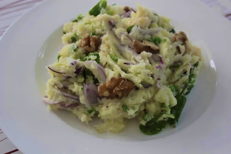 Doe nu de ui, kaas, doperwten en veldsla erbij er roer dit goed door elkaar. Voeg naar smaak wat zout en peper toe en klaar is je heerlijke stamppot. Serveer met wat walnoten.