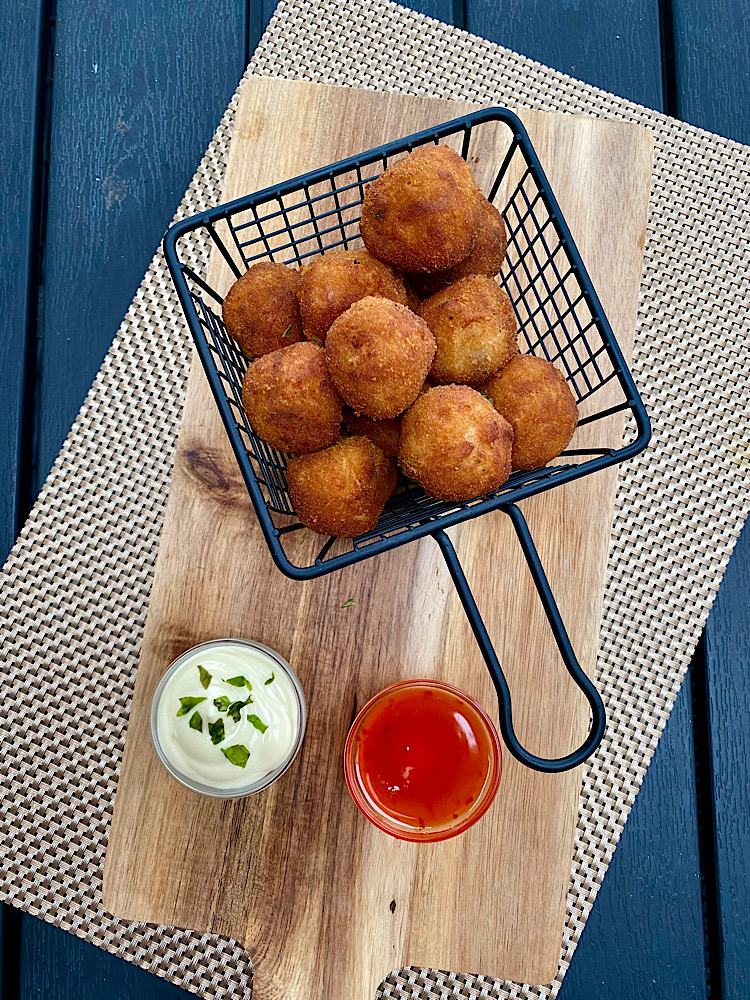 Laat dit in de koelkast in minimaal 2 uur opstijven. Maak hier vervolgens balletjes of kroketvormpjes van.