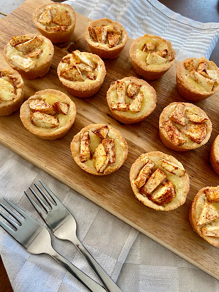 Klop het amandelspijs los met het ei totdat je een mooie, gladde massa hebt, zonder klontjes. Verdeel dit nu over de bodempjes van de vormpjes. Leg hier tenslotte de blokjes appel op.