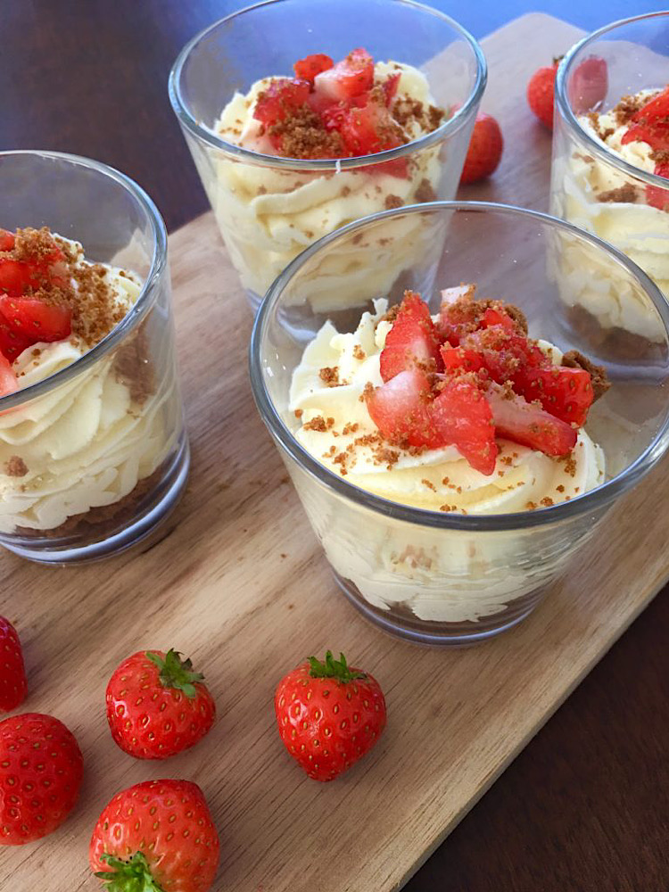 Doe de mousse in een spuitzak en spuit de dessert glaasjes vol met de mousse en garneer met witte chocoladeschaafsel en/of koekruimels en stukjes aardbeien.