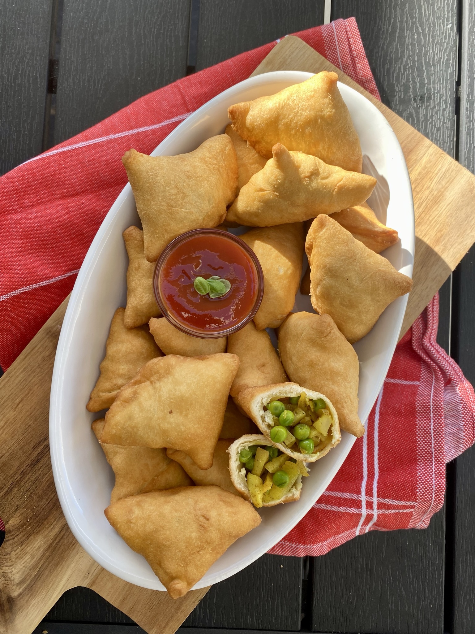 Serveer de samosa's met chilisaus, yoghurtsaus of een lekkere pittige ketchup.