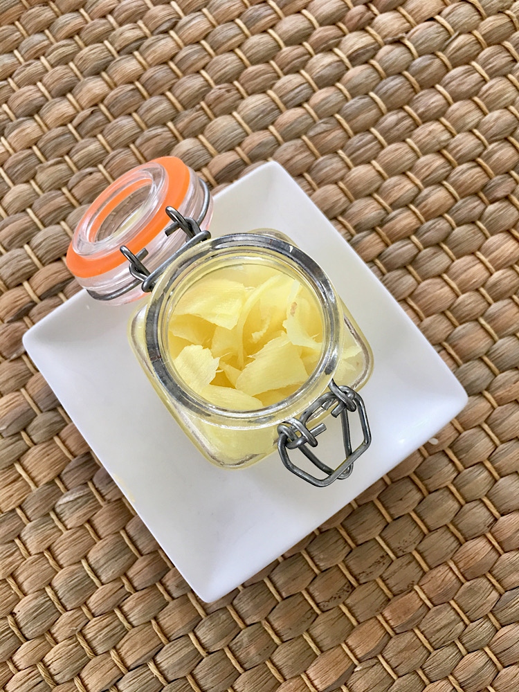 Als je wel eens sushi gaat eten, staat er altijd een schaaltje ingelegde gember op tafel. Het heeft een bijzondere pittige smaak en smaakt heerlijk bij Oosterse gerechten/salades.