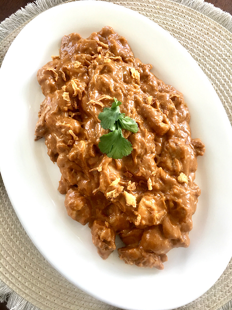 Verdun de saus eventueel met de kokosmelk.