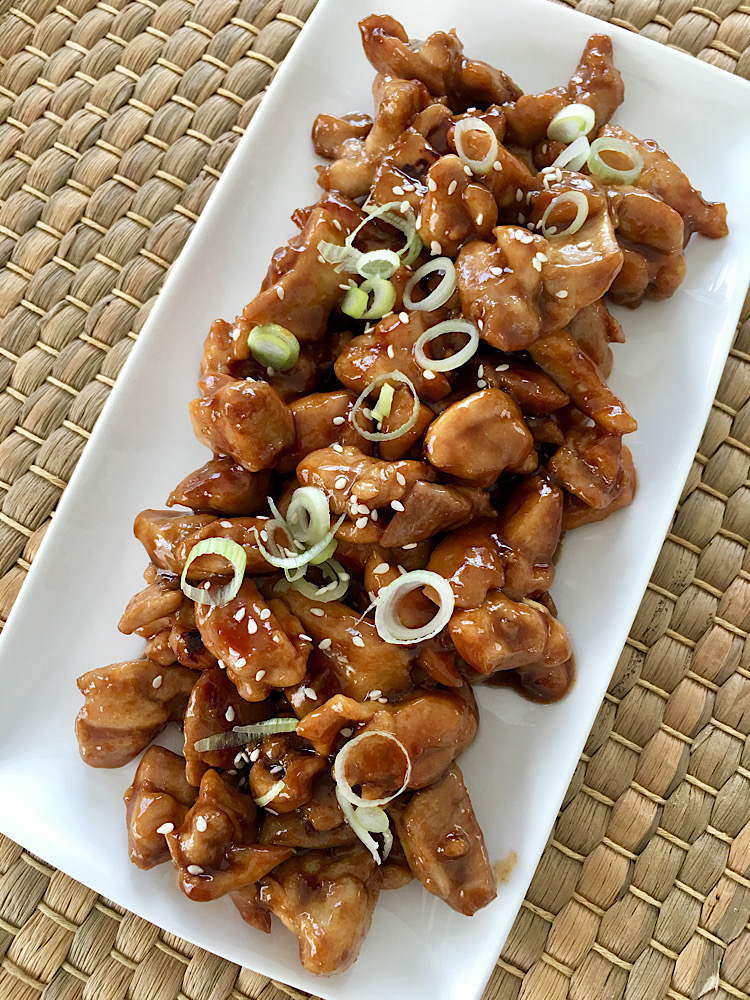 Serveerd kip met wat sesamzaadjes en fijn gesneden lente uitjes.
