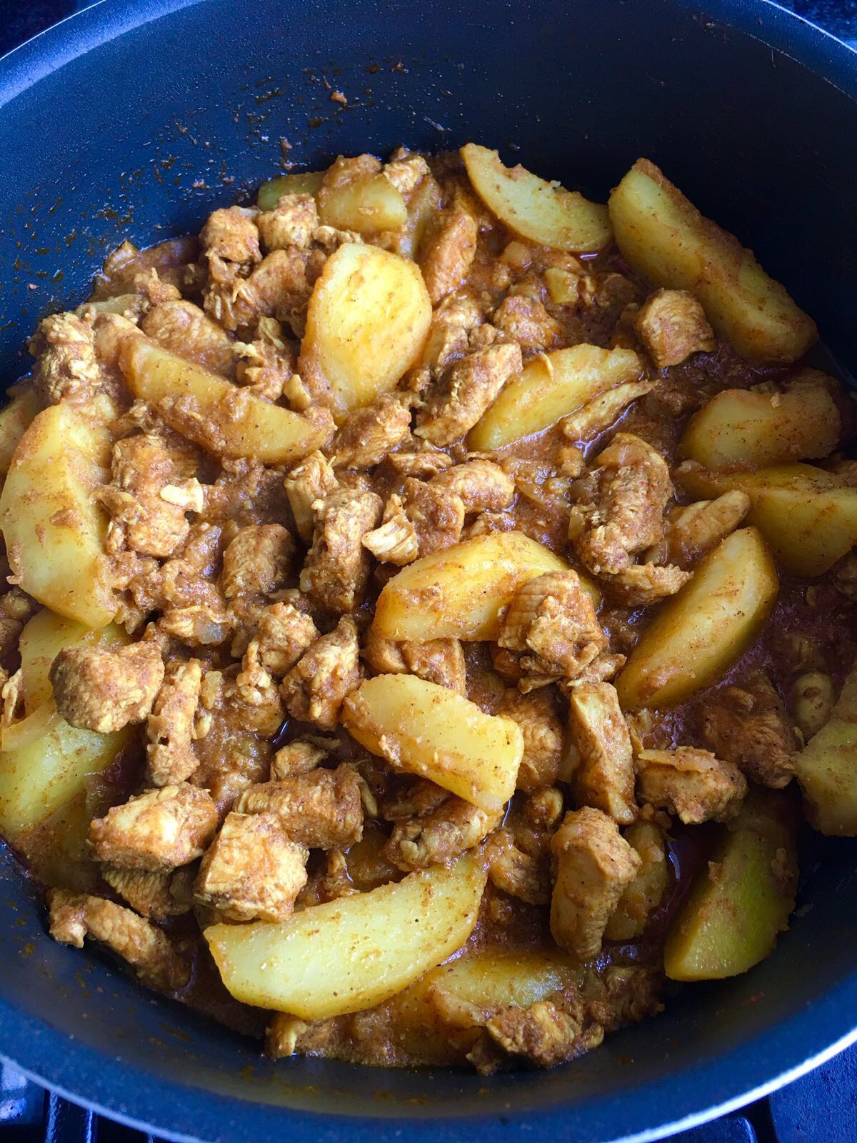 Kip met aardappelen in masala kennen de meeste Hindoestanen wel. Wij vinden het in ieder geval heerlijk. Mijn man zegt bij dit gerecht altijd, je eet eigenlijk wel dubbel zoveel calorieën, aardappelen en rijst in 1 gerecht. Moet ik altijd wel om lachen en hij heeft ook wel gelijk, maar het is niet zo dat we dit dagelijks eten. Dus als dit op tafel komt, dan genieten we er ook extra van. Oh ja, je kunt hier de rijst natuurlijk bij weg laten en er bijvoorbeeld gebakken spitskool of snijbonen bij eten, ook erg lekker.