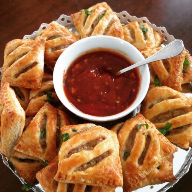 Laat het bladerdeeg ontdooien tot kamertemperatuur. Verwarm de oven voor op 220 graden (boven onder warmte). Doe daarna alle ingrediënten in een kom en roer dit goed door tot een mooi mengsel. Het bladerdeeg snij je in tweeën, vervolgens neem je een eetlepel van het gehaktmengsel en leg je dit op een het bladerdeeg. Je vouwt het pakketje dicht en met een vorkje druk je de randen goed dicht. Met een mesje, maak je drie sneden aan de bovenkant, wat een mooi effect geeft. Hierdoor kan ook het vocht wat verdampen.