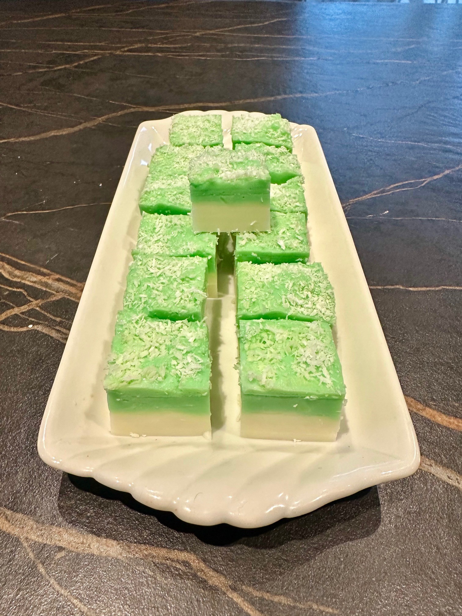 We zijn er gek op thuis, lapis. Lapis is de Surinaamse variant van de Indische (gestoomde) Kue lapis. Ook heerlijk. Maar dit is echt zoveel minder werk. Je kunt ze maken in allerlei kleuren en smaken, maar de pandan smaak is toch echt wel mijn favoriet. Een heerlijke snack voor een feestje!