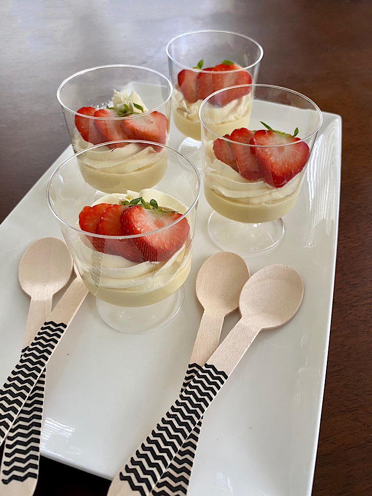 Voor het opdienen, klop je de mascarpone los met wat zoetstof. Doe dit in een spuitzak en spuit een mooie toef op de vla, garneer met wat plakjes aardbeien.