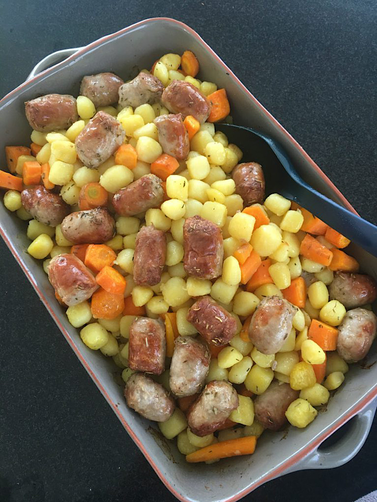 Voordat de schaal de oven in gaat, leg je de braadworsten bovenop de aardappelen en wortelen.