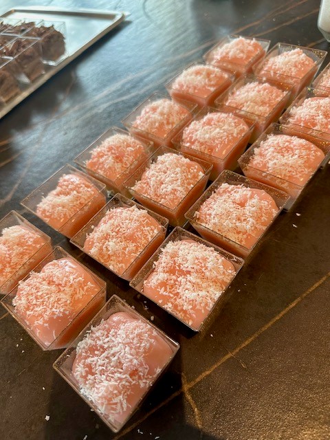 Verdeel de witte pudding over de glaasjes en vervolgens de roze pudding hierop. Bestrooi met geraspte kokos en laat dit 3 uurtjes opstijven in de koelkast.