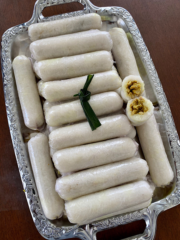 Deze gevulde rolletjes kleefrijst worden meestal in huishoudfolie gewikkeld om ze warm te houden. In Indonesie gebruikt men meestal bananenbladeren. Je kunt ze opwarmen door ze even te stomen maar opwarmen in de magnetron gaat ook prima. Ik maakte meteen een grote voorraad, zodat ik ze in de vriezer kon doen. 1 minuut opwarmen in de magnetron en ze zijn net zo vers.