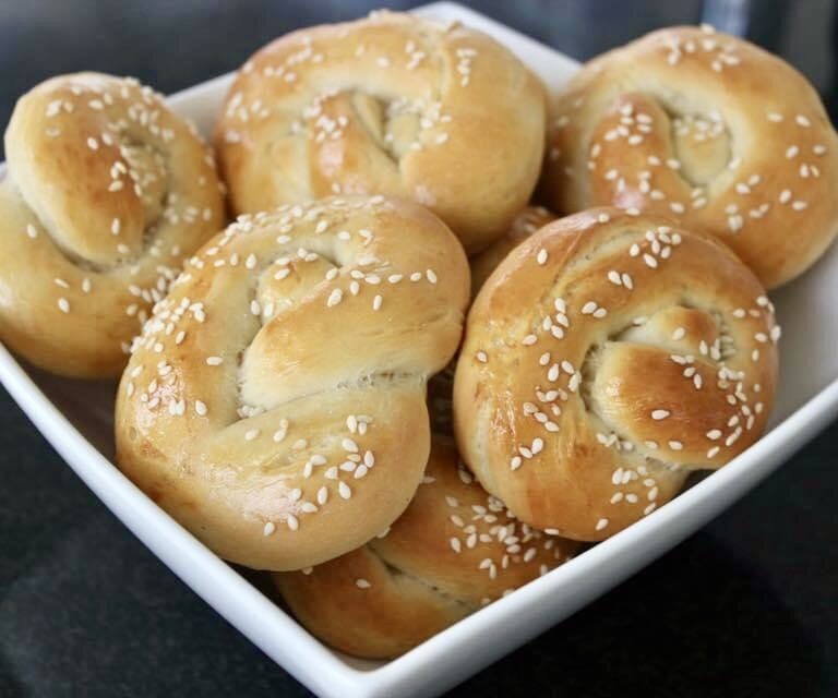 Na een uur haal je het deeg uit de kom en kneed je het lichtjes door. Verdeel het deeg in 20 stukjes. Je kunt hier nu allerlei vormen van maken. Ik maakte broodjes in de vorm van een krakeling en kleine bolletjes. Nadat je de broodjes gevormd hebt, leg je ze op een bakplaat bekleed met bakpapier. Dek de broodjes af met een stuk huishoudfolie en laat nog even 20 minuten rijzen. Voordat ze de oven in gaan, smeer je ze in met wat geklopte ei en eventueel met sesamzaadjes.