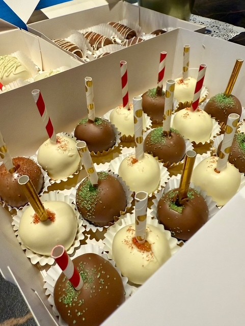 Dip de cakepops in de chocolade en leg ze op een bakpapier. Bestrooi ze meteen met wat eetbare decoratie zodat de decoratie meteen hecht aan de chocolade.
