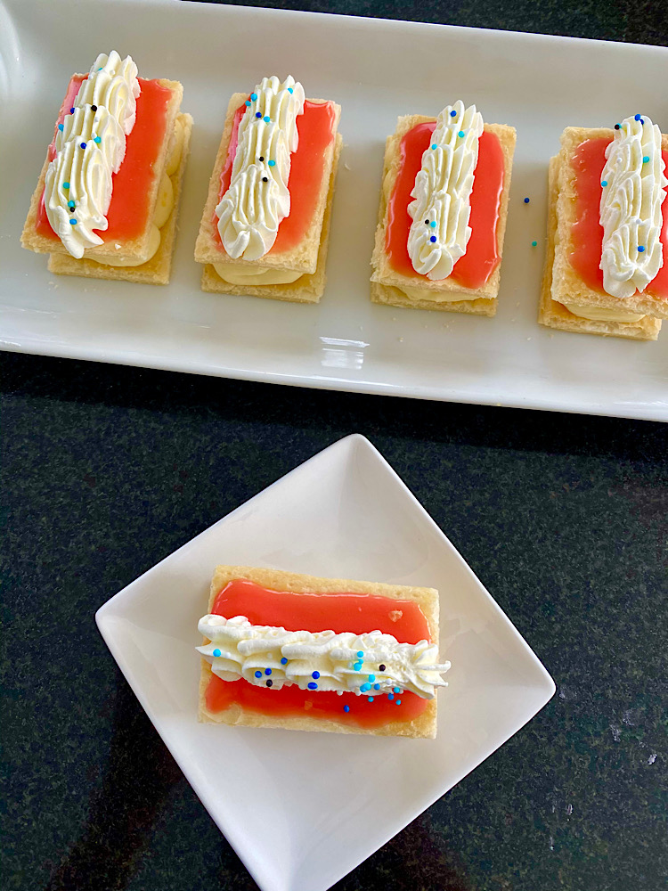 Neem nu 1 plakje bladerdeeg en leg de opgestijfde vanillecreme hierop. Leg een plakje met glazuur hierop en smeer de zijkanten glad met een mes. Herhaal dit met de overige plakjes.