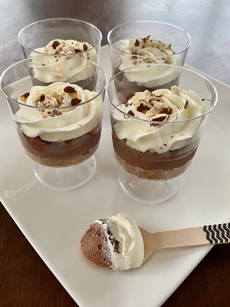 Klop de slagroom stijf met de poedersuiker. Spuit mooie toeven in de glaasjes en strooi wat gestampte hazelnoten over de toeven.