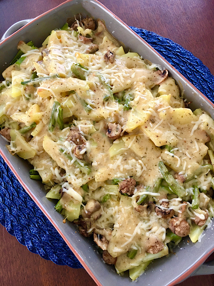 Ze zijn er thuis gek op, aardappelschijfjes uit de oven met die lekkere “aardappel anders” saus erover. Ik kocht deze normaal uit het bekende potje maar nu probeerde ik deze zelf uit. Een stuk gezonder en vrij van ongezonde E-nummers. Deze ovenschotel viel erg in de smaak, ik zal dan ook zeker nooit meer de saus uit het potje kopen. Je kunt de groentes vervangen door groente die jij zelf lekker vindt, ook kun je hier bijvoorbeeld stukjes kipfilet of gehakt aan toevoegen. Varieer erop los zou ik zeggen…