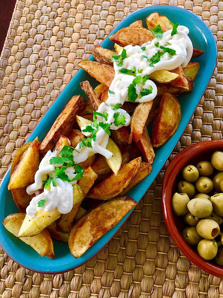Patatas braves met tomatensalsa is erg lekker maar stiekem vind ik patatas bravas met een pittige aioli nog lekkerder. Hierbij een snelle variant van deze saus. De originele patatas bravas worden gefrituurd in olijfolie, je kunt ze ook in de oven bakken.