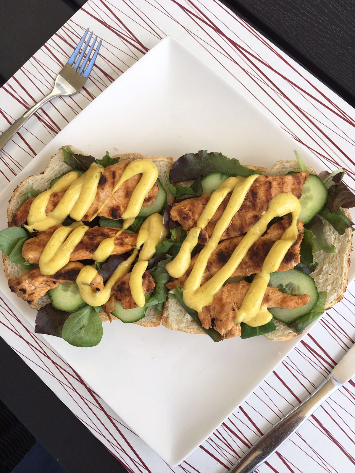 Op eerste Pinksterdag bleven de broer en de beste vriend van mijn man logeren. Ik maakte deze heerlijke pikant gegrilde kip op twee grof gesneden plakken brood met kerrie mayonaise voor de lunch. Ik at een soort gelijk gerecht al eerder in een eetcafe en sindsdien wilde ik dit al een hele tijd namaken en dan uiteraard mijn eigen versie. Onze logeetjes hebben gesmuld, net als wij.