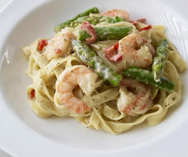 Fruit de knoflook in de olijfolie glazig, doe hier de rode peper en de pesto bij, bak dit nog even mee. Nu mogen de scampi's erbij. Dit alles roerbak je ca 1 minuut op hoog vuur. Snij de asperges in 3 stukjes en voeg deze ook toe. Schep alles nog een keer goed om in de pan. Als laatste doe je de kookroom erbij en zout en peper naar smaak. Verwarm het geheel nog even goed door en klaar is je saus. De gekookte tagliatelle mogen nu erbij en opscheppen maar.