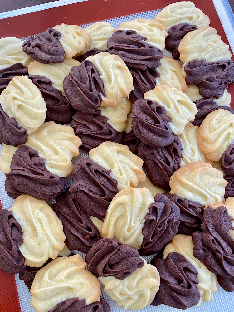 Doe het beslag in 2 spuitzakken en gebruik een stervormige spuitmond. Spuit op een bakplaat bekleed met bakpapier een klein zig zag vormpje met vanille kleur en hier tegenaan een zigvormpje met cacaobeslag. Je kunt uiteraard ook je eigen fantasie gebruiken voor de vormen.