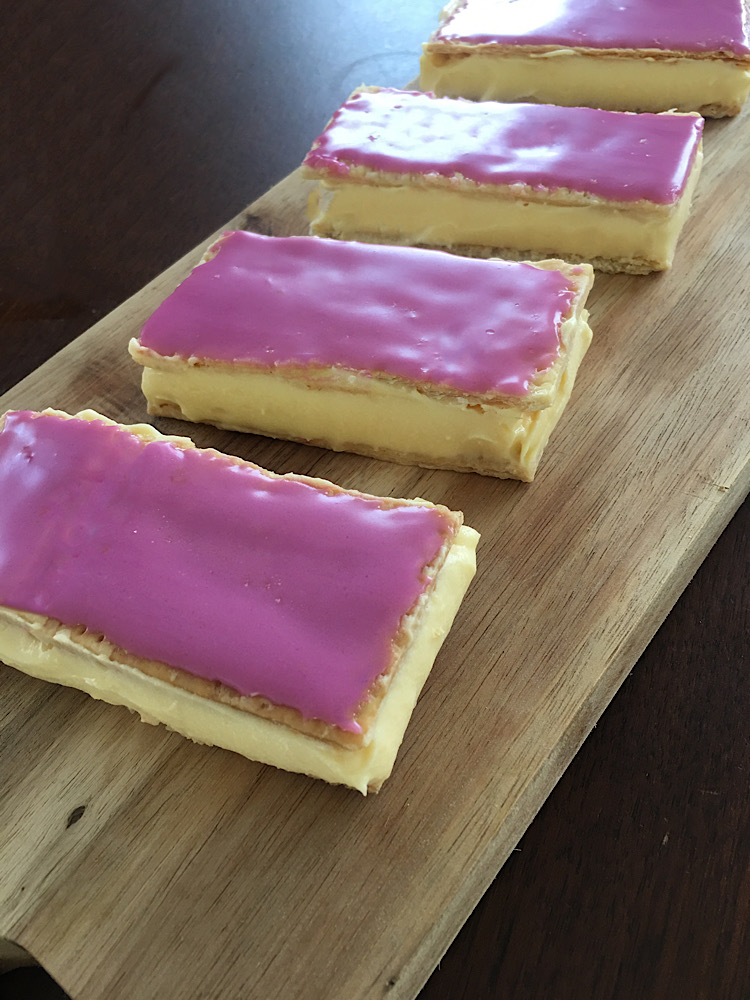 Neem nu 1 plakje bladerdeeg en leg de opgestijfde vanillecreme hierop. Leg een plakje met glazuur hierop en smeer de zijkanten glad met een mes. Herhaal dit met de overige plakjes.