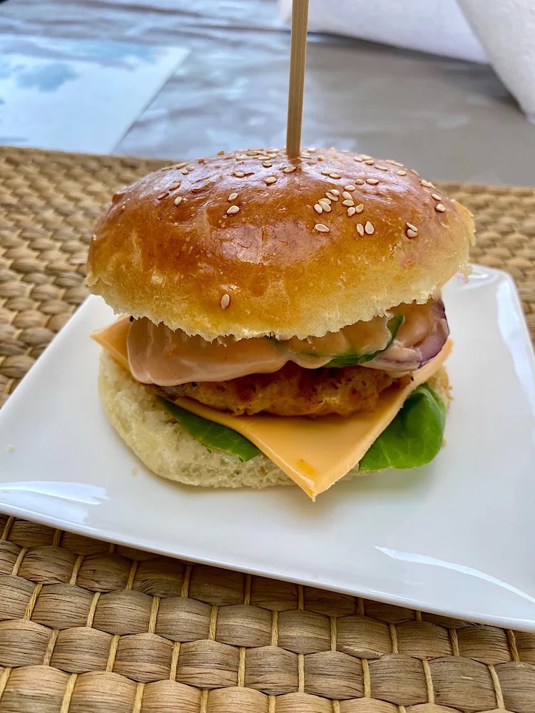 Deze home made kipburgers zijn echt een feestje! In het zonnetje hebben we genoten van deze goed gevulde burgers! Een tijdje geleden maakte ik ook zelf de hamburgerbroodjes. Maar heb je haast of gewoon geen zin dan haal je uiteraard wat broodjes bij de bakker of supermarkt. Ook erg lekker. De kipburgers zijn ook heerlijk op de bbq. Vandaag gebruikte ik de grillpan om de burgers te bakken.