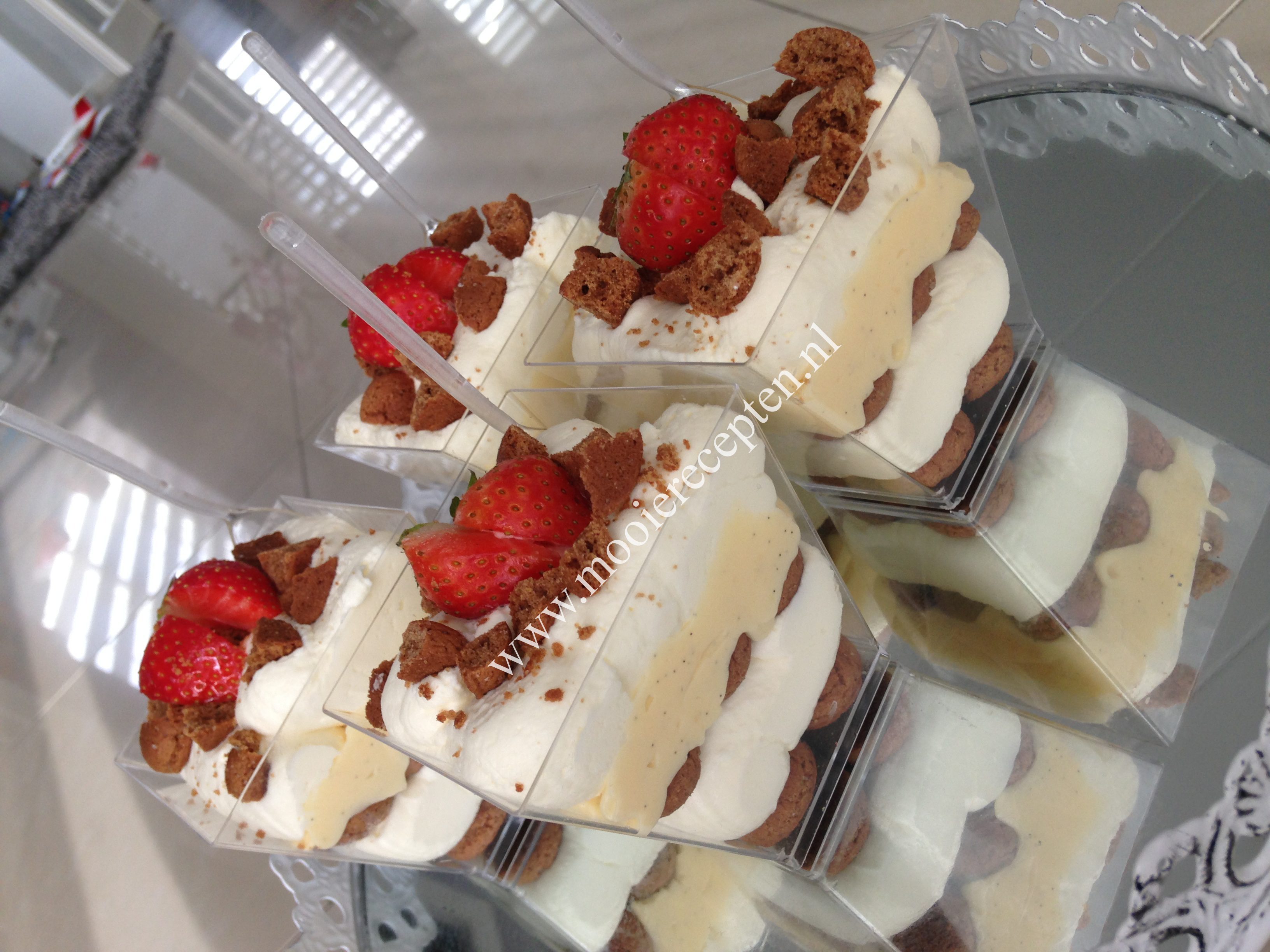Allereerst bedek je de bodem met een laagje kruidnoten, daarna spuit je hier een laag slagroom mascarpone mengsel overheen. Vervolgens weer een laag kruidnoten, daarna een laagje banketbakkersroom. Sluit af met een laagje van het slagroom mascarpone mengsel.