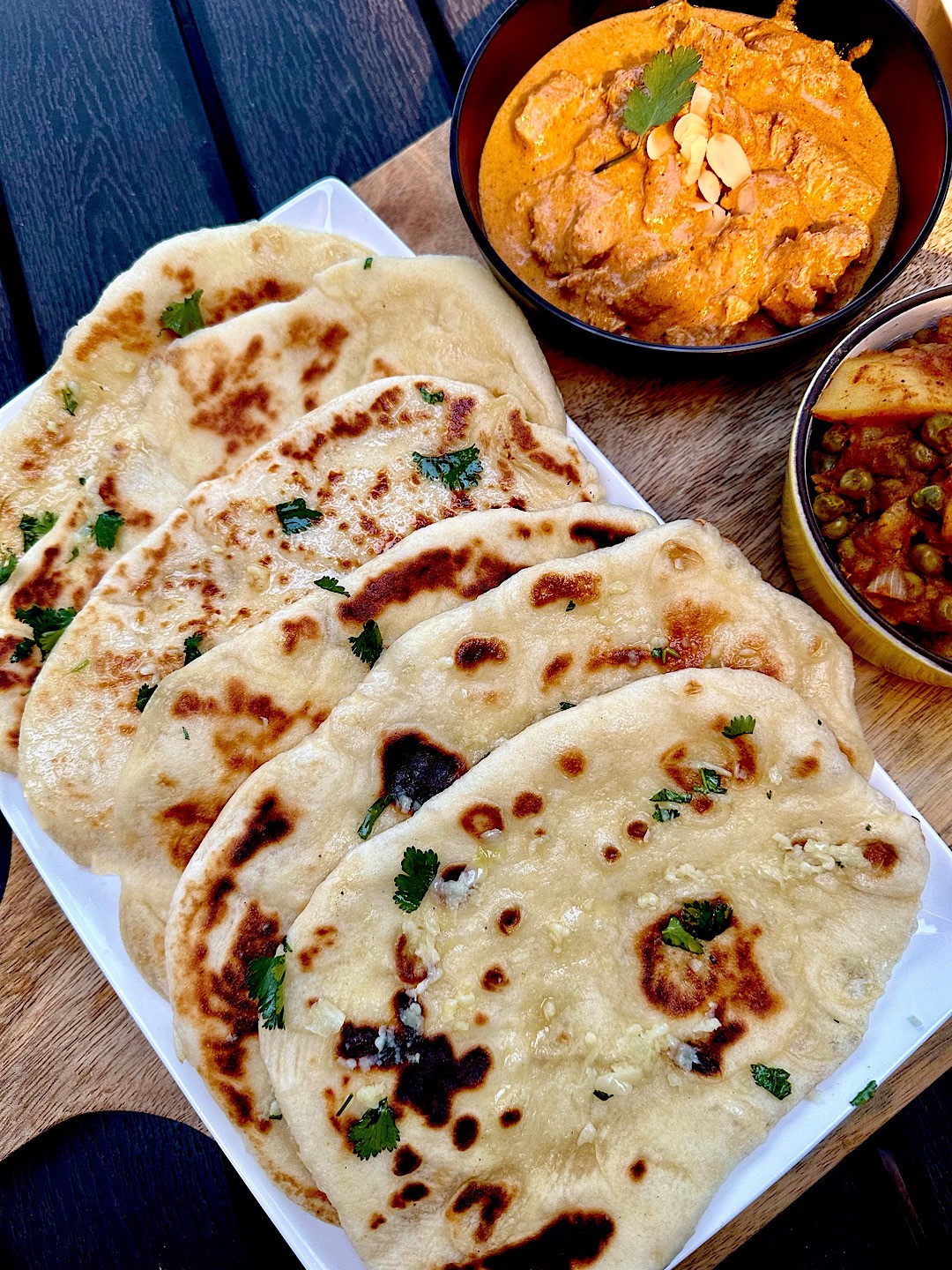 Bewaar de naan in een schone theedoek, zo blijven ze lekker zacht. Voor het opdienen smeer je de naan in met de knoflookboter.