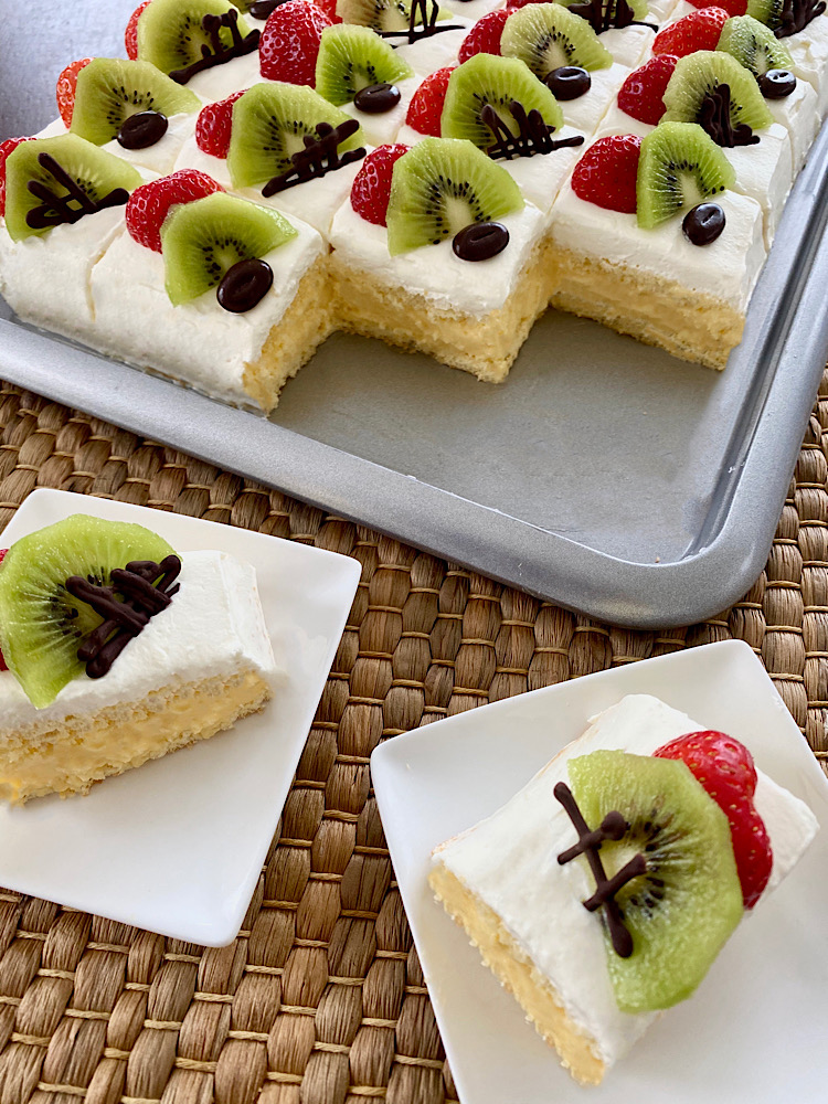 Snij de biscuit doormidden en smeer de banketbakkersroom over de eerste laag. Plaats de tweede laag biscuit hierop. Smeer hier nu gelijkmatig de roomkaasfrosting over, bedek ook de zijkanten van de taart met de frosting. Laat de taart nu stevig worden in de koeling voordat je het gaan aansnijden. Snijd de taart vervolgens in rechthoekige of vierkante stukjes. Garneer met stukjes aardbei en kiwi en chocolade.