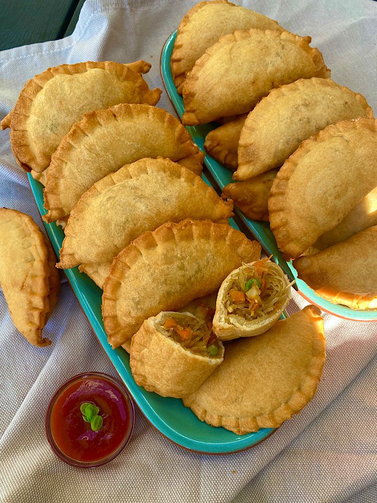Met Navratri ( periode dat er vegetarisch wordt gevast door de Hindoestaanse gemeenschap) maak ik altijd wat vegetarische hapjes die ik kan invriezen. Zo hebben we thuis altijd een lekkere vegetarische snack binnen handbereik. Een paar minuten in de airfryer en je hebt de lekkerste snack. Mijn kids en ik zijn gek op Indische pasteitjes en halen deze regelmatig bij onze Toko. Ik probeerde deze nu zonder kip en ei te maken en verving de kip door gefrituurde aardappelblokjes, maar dit kan ook prima met stukjes tempeh of stukjes tahoe. Dit was zo lekker!