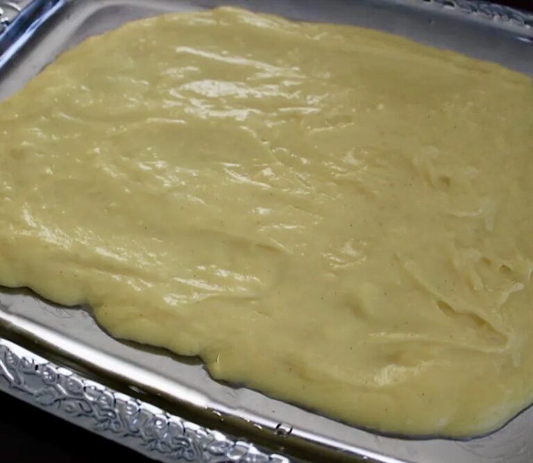 Giet de banketbakkersroom in een lage platte schaal en dek deze af met plasticfolie tot gebruik. Mocht je merken dat je banketbakkersroom toch klontjes heef, haal het dan even door een zeef.